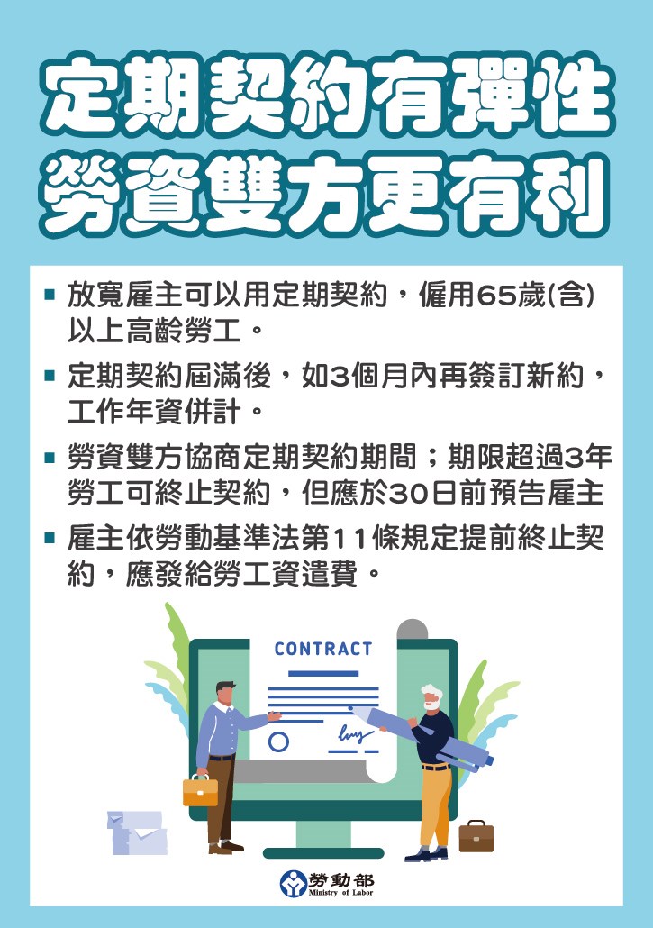 為與時俱進、落實職場平等,《中高齡者及高齡者就業促進法》大幅提升約定勞動契約的規定之彈性,從以往雇主依法僱用勞工時,除非職務有臨時性、短期性、季節性、特定性才可簽不定期契約,否則一律應視為「不定期契約」的規定,改成可開放雇主「定期契約」方式,僱用 65 歲以上勞工。