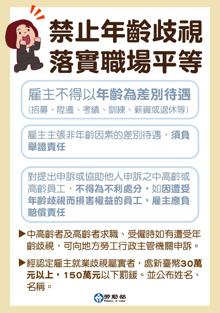 中高齡者及高齡者就業主要面臨年齡歧視、社會刻板印象等問題,因此訂定「禁止年齡歧視」專章,禁止雇主因年齡因素,歧視求職或受僱之中高齡者及高齡者,範圍重從招募、升遷、考績、考核、退休等皆是。受雇者如有遭受年齡歧視,是可以向地方勞工行政主管機關申訴的!(同場加映:特休懶人包|掌握週年制、曆年制正確休假數就靠這幾招)
